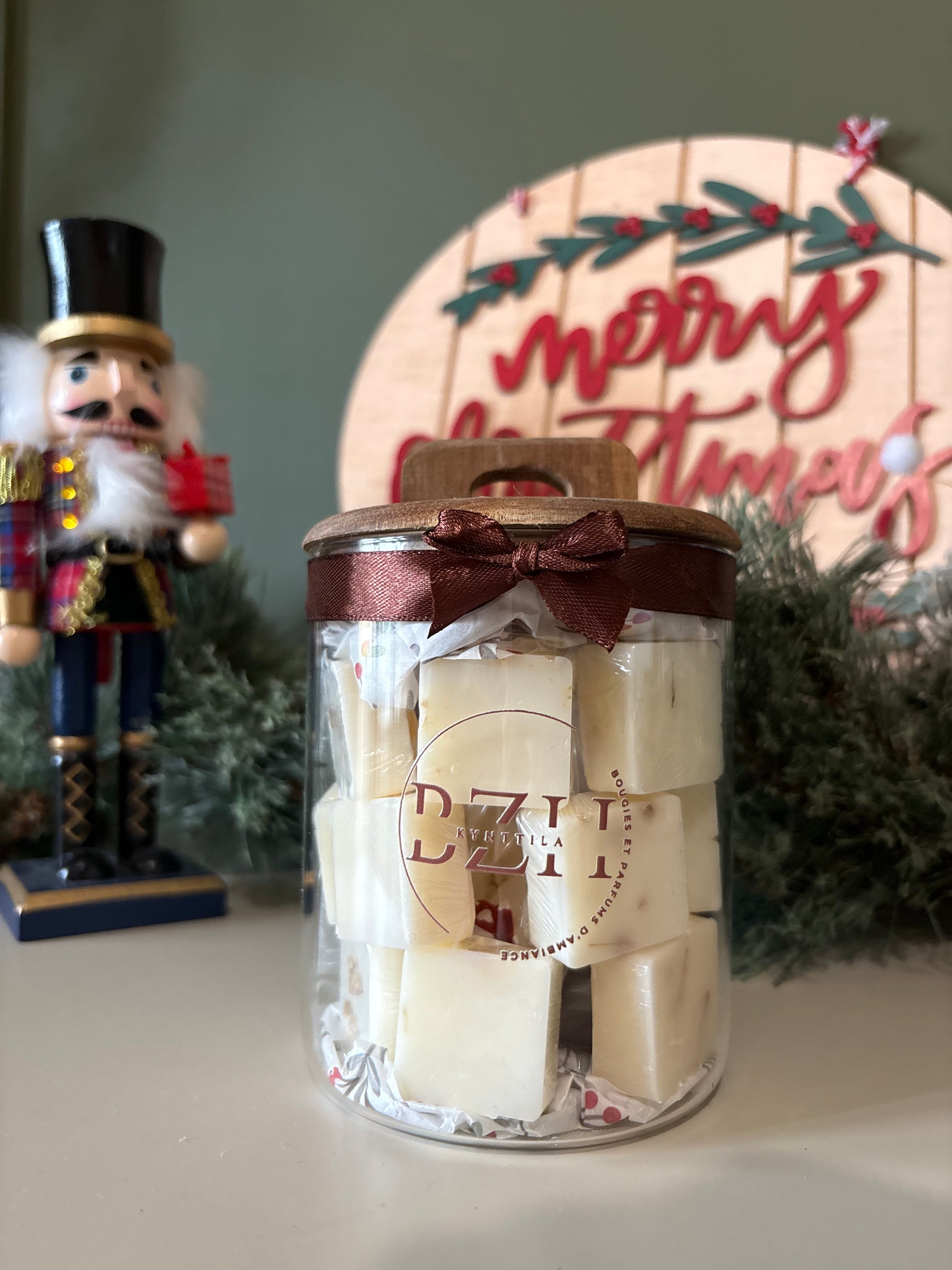 Bocal en verre comprenant 18 fondants parfumés de la collection. Un mix de parfums de noël, fruités, floraux et gourmands. Et un sachet de fondant parfumés en forme de sapin (fragrance variable)